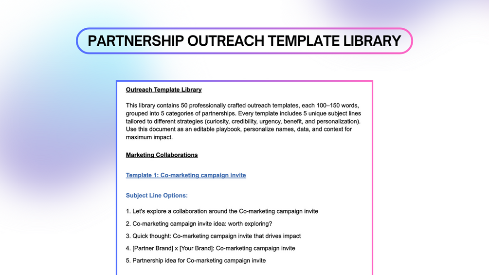 - 50-Template Partnership Outreach Library – Proven outreach emails and messages to start new collaborations instantly.